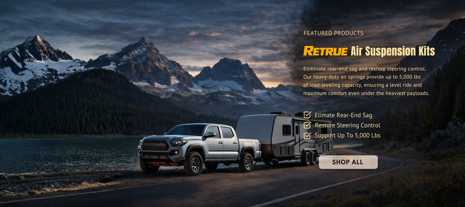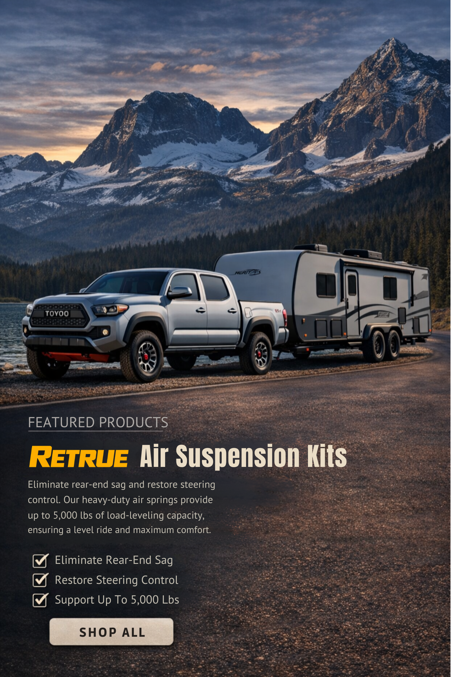 "Truck squat" occurs when the rear suspension is overloaded. RETRUE air springs provide up to 5,000 lbs of load-leveling capacity. By adjusting the air pressure, you can level your truck back to its factory height, eliminating sag and preventing the "nose-up" position that compromises front-tire traction.