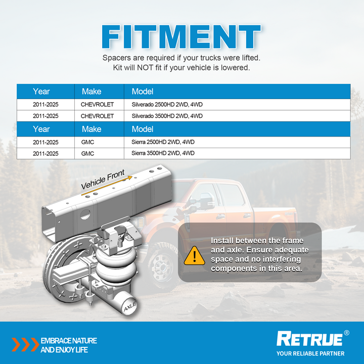 Upgrade your Chevrolet Silverado 2500HD/3500HD or GMC Sierra 2500HD/3500HD (2011–2025, 2WD & 4WD) with the RETRUE Rear Air Suspension Kit, a precision-engineered replacement for the Firestone Ride-Rite 2613 kit.