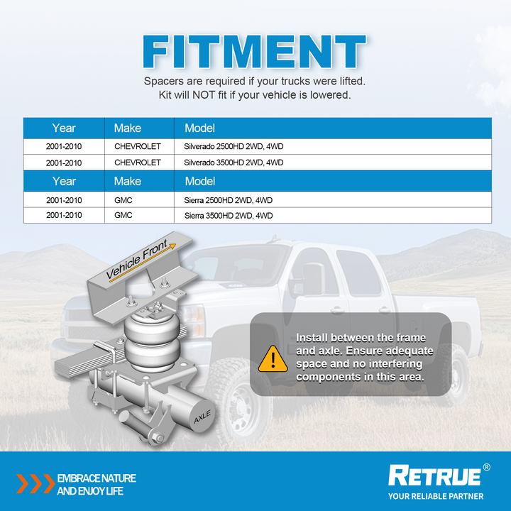 Boost your Chevy Silverado 2500HD / 3500HD or GMC Sierra 2500HD / 3500HD (2001–2010, 2WD & 4WD) with the RETRUE Heavy-Duty Rear Air Suspension Kit, a dependable air spring load support system built for towing and hauling performance.
