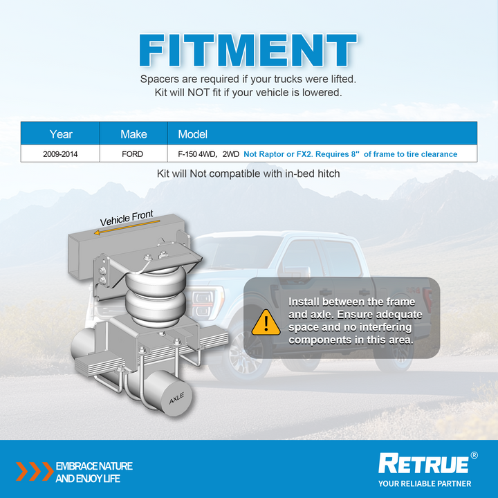Upgrade your Ford F-150 (2009–2014) with the RETRUE Rear Air Suspension Kit, the perfect replacement for the Firestone Ride-Rite 2525 kit. This heavy-duty air bag helper spring system delivers up to 5,000 lbs of load-leveling capacity, reducing rear sag, shock, and vibration for a smoother, safer, and more controlled ride — especially when towing or hauling.