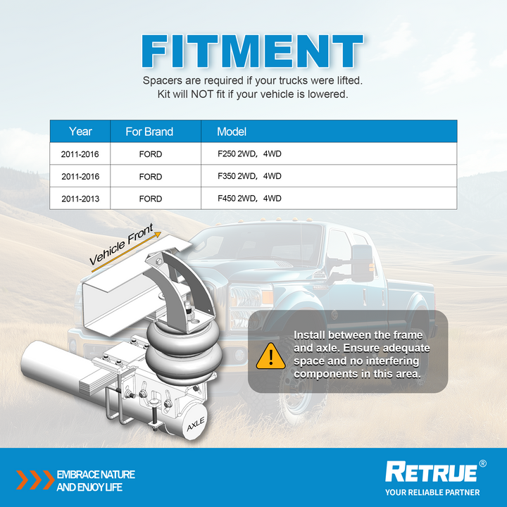 Upgrade your Ford F-250, F-350 (2011–2016, 2WD & 4WD) or Ford F-450 (2011–2013, 2WD & 4WD) with the RETRUE Rear Air Suspension Kit — a heavy-duty air helper spring replacement for the Firestone Ride-Rite 2597 kit.
