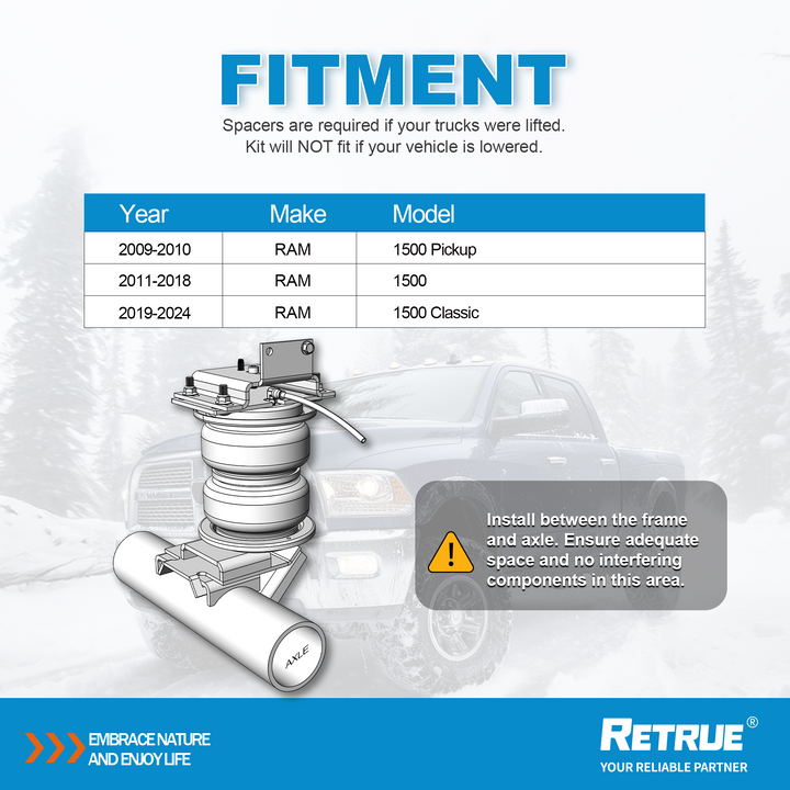 Enhance your RAM 1500’s performance with the RETRUE Air Suspension Kit, a heavy-duty rear air bag helper spring system built for stability and comfort.