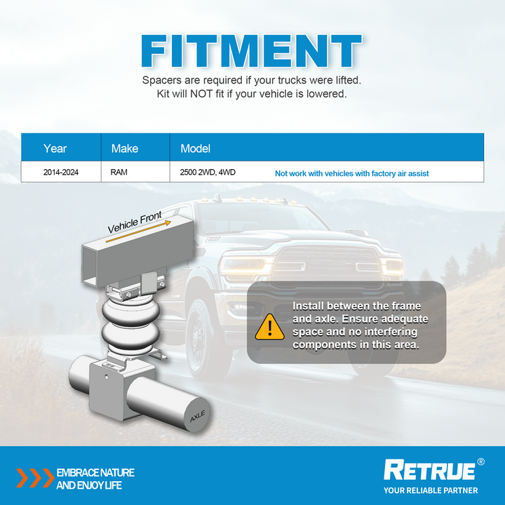 Enhance your RAM 2500 (2014–2024, 2WD & 4WD) with the RETRUE Rear Air Suspension Kit, the ideal replacement for the Firestone Ride-Rite 2598 Air Helper Spring kit. (Note: Not compatible with factory air assist models.)