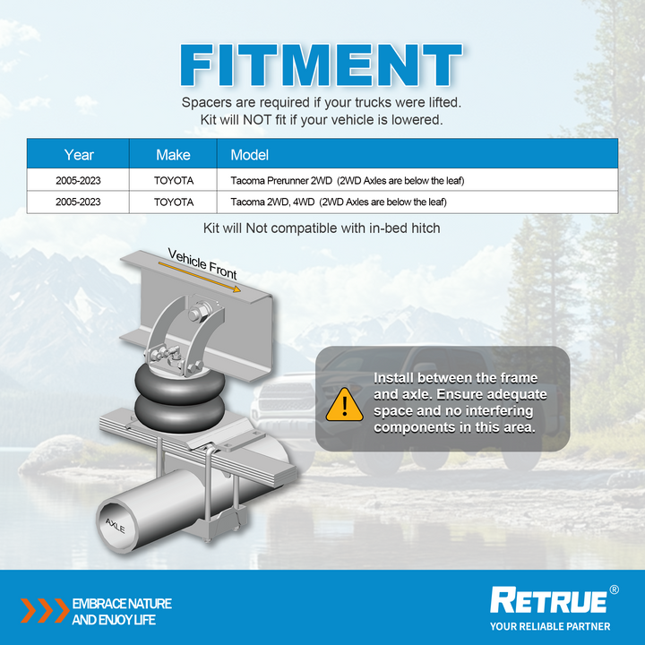 This Air Suspension Kit is compatible with :  TOYOTA Tacoma Prerunner 2WD 2005-2023 and Tacoma 2WD/4WD 2005-2023(2WD Axles are below the leaf)